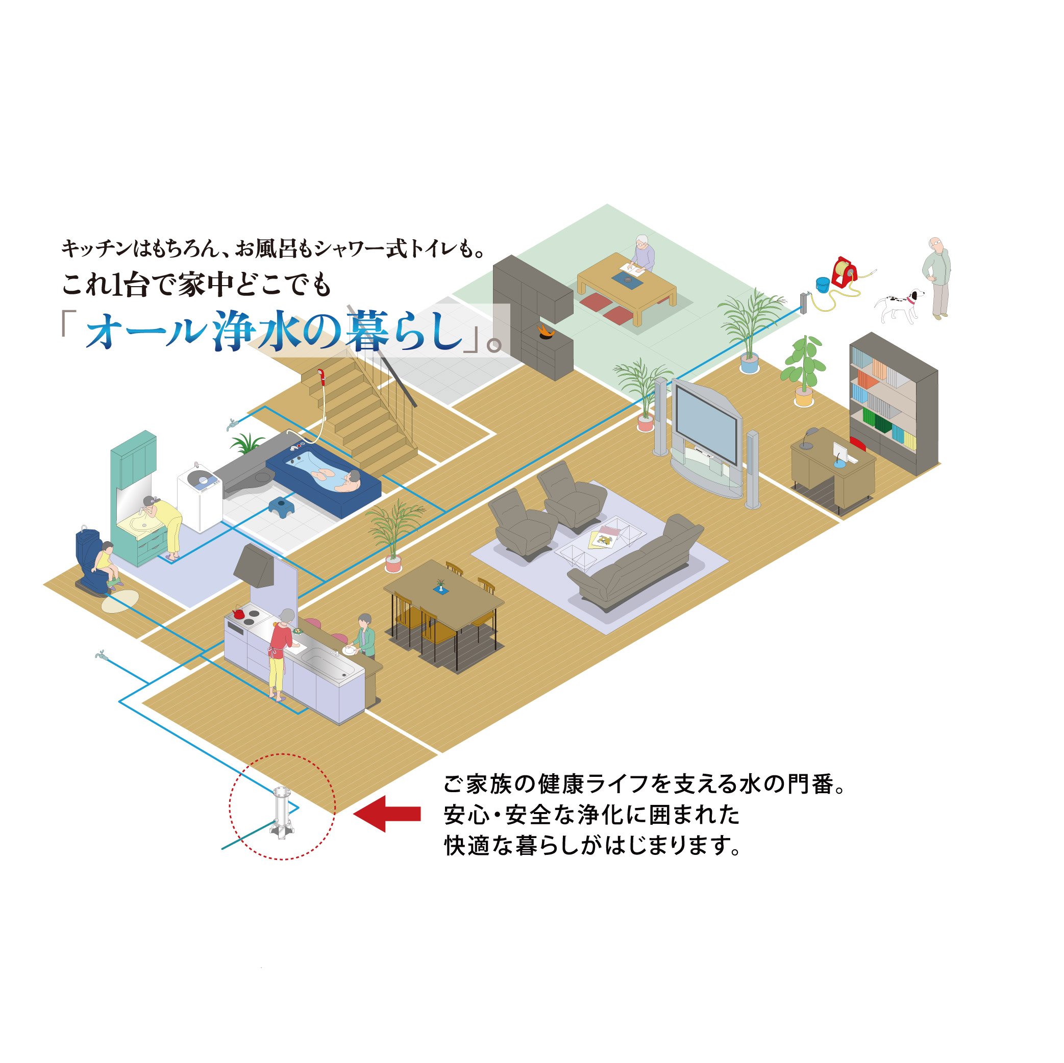 わずか一台で家中に「天然水」のような、おいしくて安全な水を供給します。